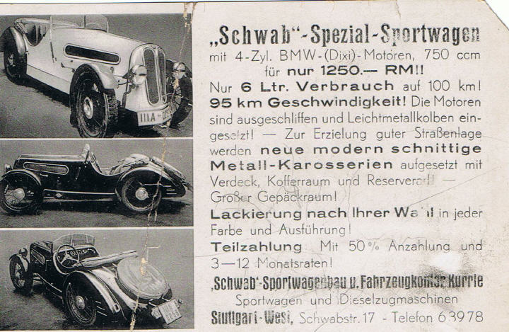 Schwab![]() Diese Werbepostkarte verschickte in den 30er Jahren die Firma "Schwab"-Sportwagenbau u. Fahrzeugkontor Kurle aus Stuttgart. Sie ist adressiert an Herrn Guido Dimitz, Bergheim/Erft, Commerstrasse Nr. 4. Diese liegt mir im Original vor.